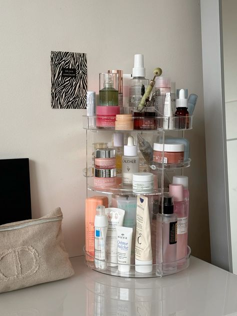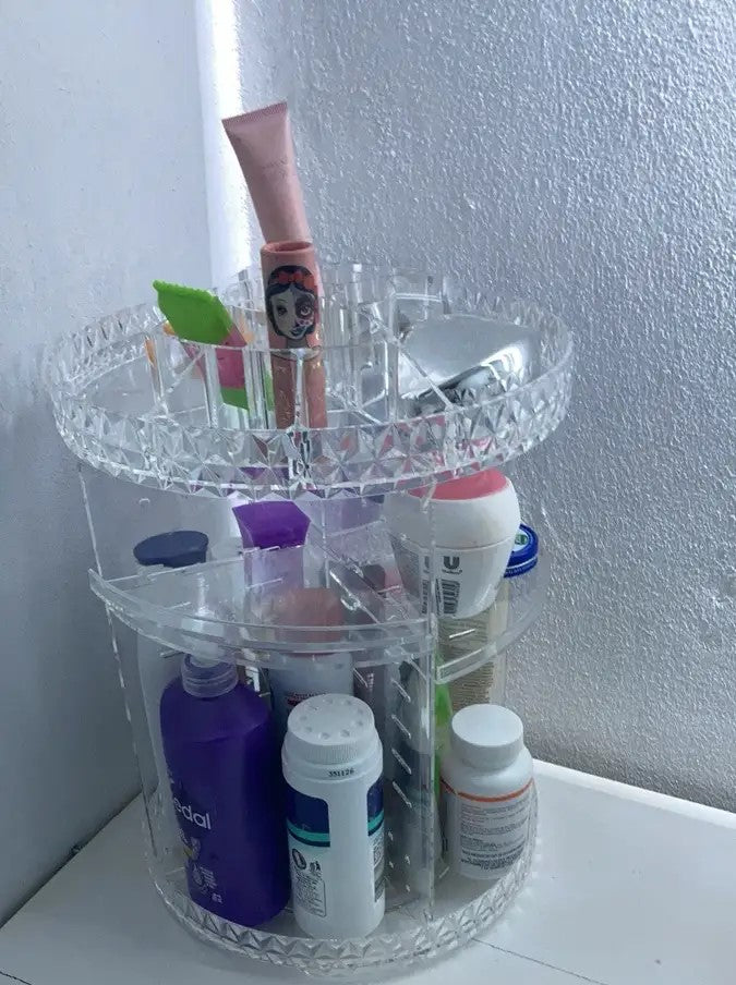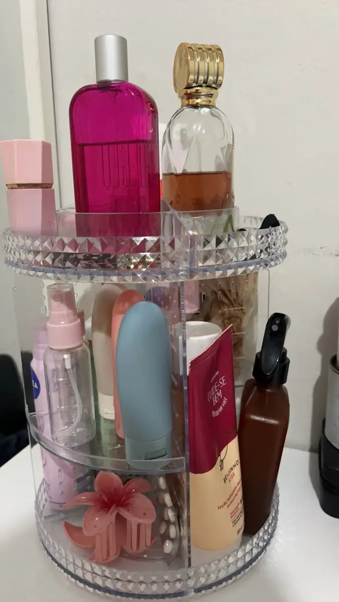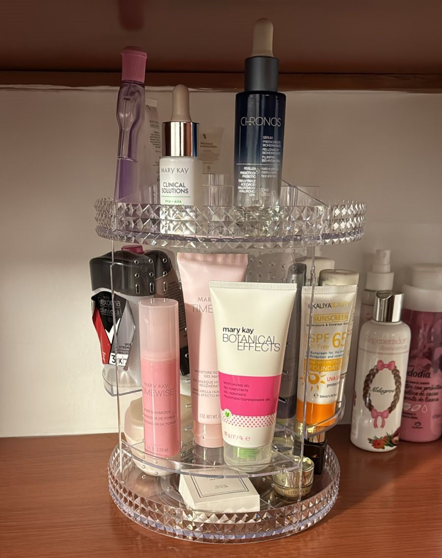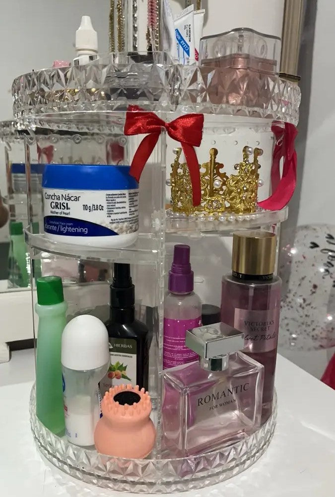 Basta de revolver cajones y perder tus productos favoritos. Con este Organizador Giratorio 360° verás todo de un solo vistazo y tendrás tus cosméticos listos en segundos. Más orden, menos estrés y un tocador digno de una reina. 💖
