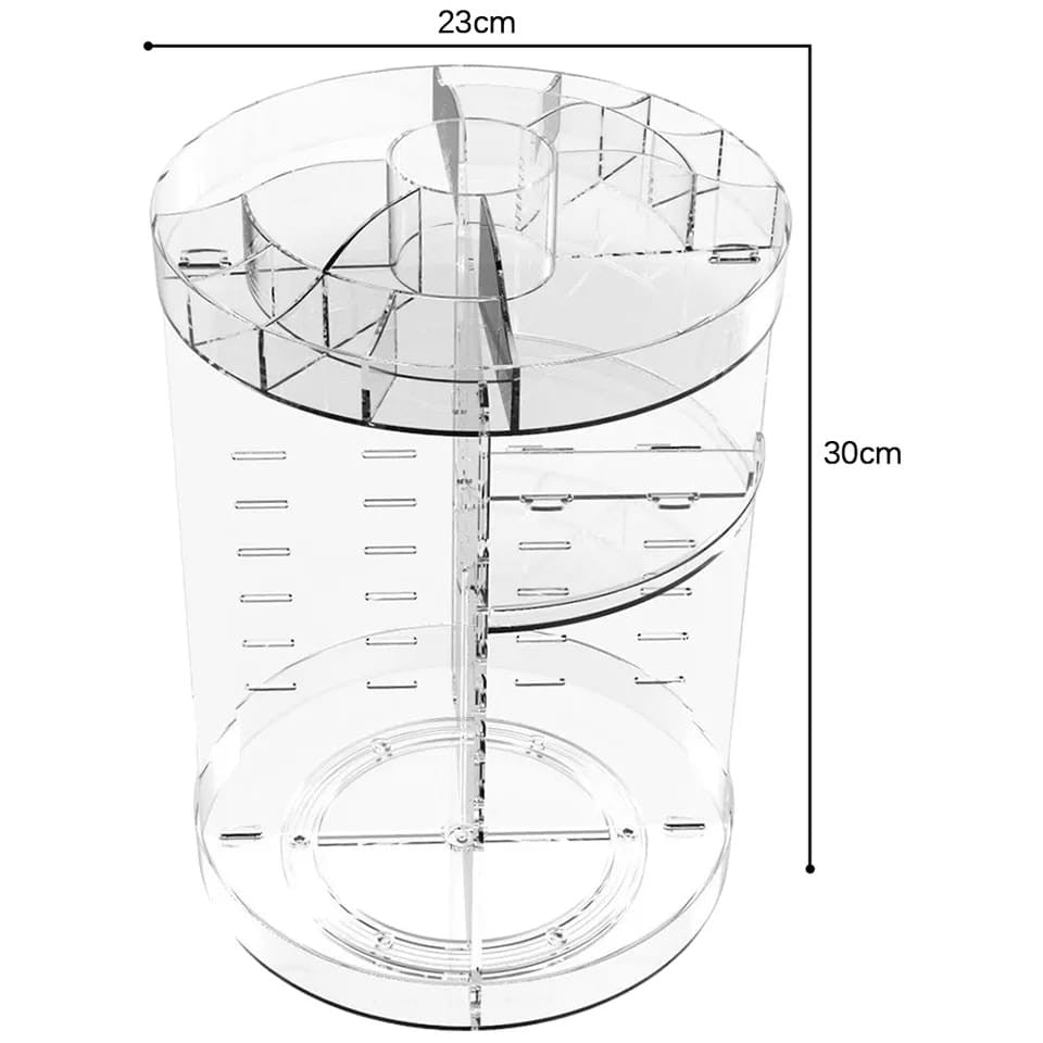 El organizador tiene una altura aproximada de 30 cm y un diámetro de 23 cm, lo que lo hace ideal para guardar desde pequeños cosméticos como labiales y sombras, hasta frascos grandes de perfumes, productos para el cuidado de la piel y brochas de maquillaje.